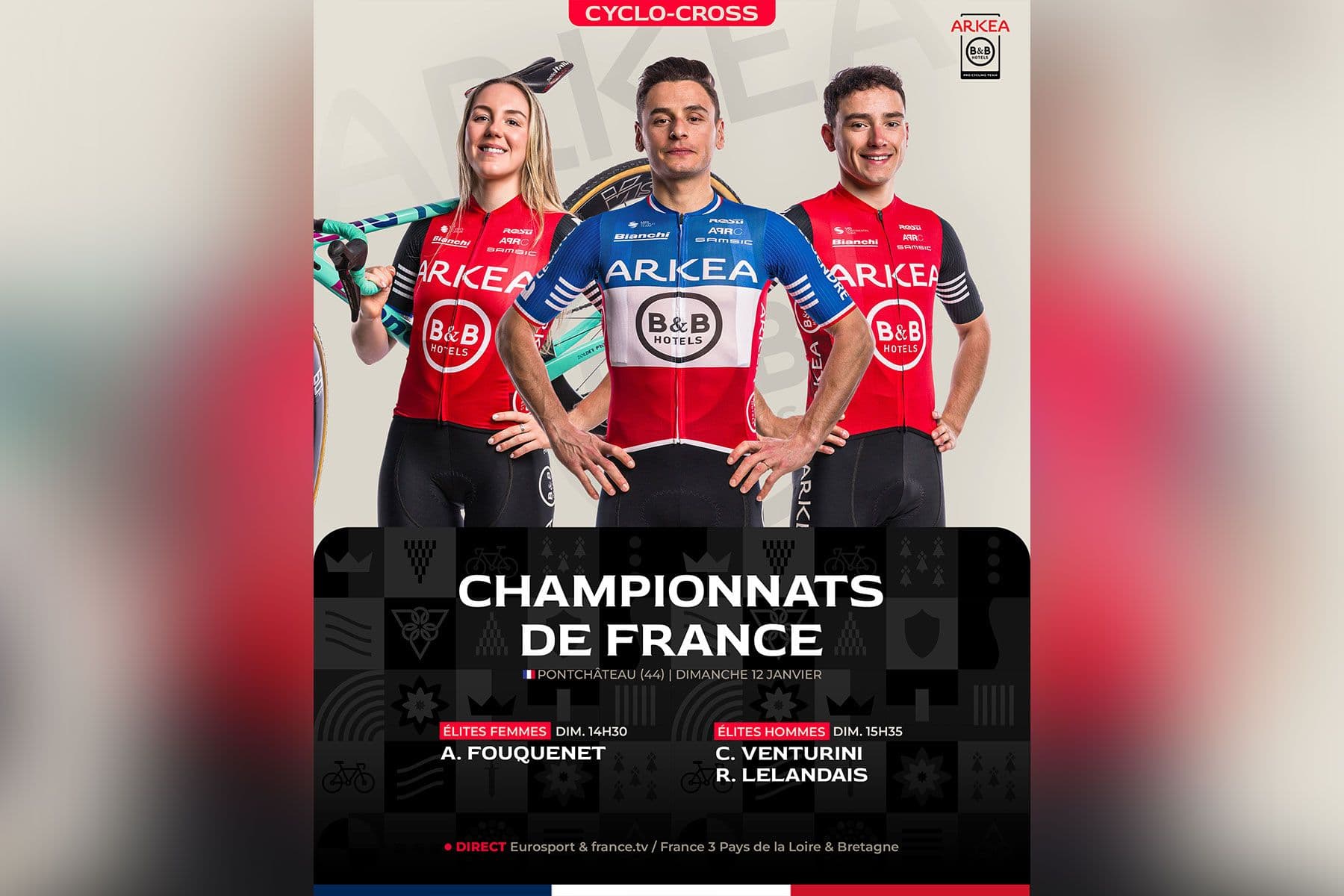 L'équipe cyclo-cross ARKEA-B&B HOTELS aura l’ambition de décrocher le maillot tricolore sur le circuit de Coët Roz à Pontchâteau ce dimanche. Un tracé sur lequel nos trois coureur(e)s Amandine Fouquenet, Clément Venturini et Rémi Lelandais ont brillé par le passé.