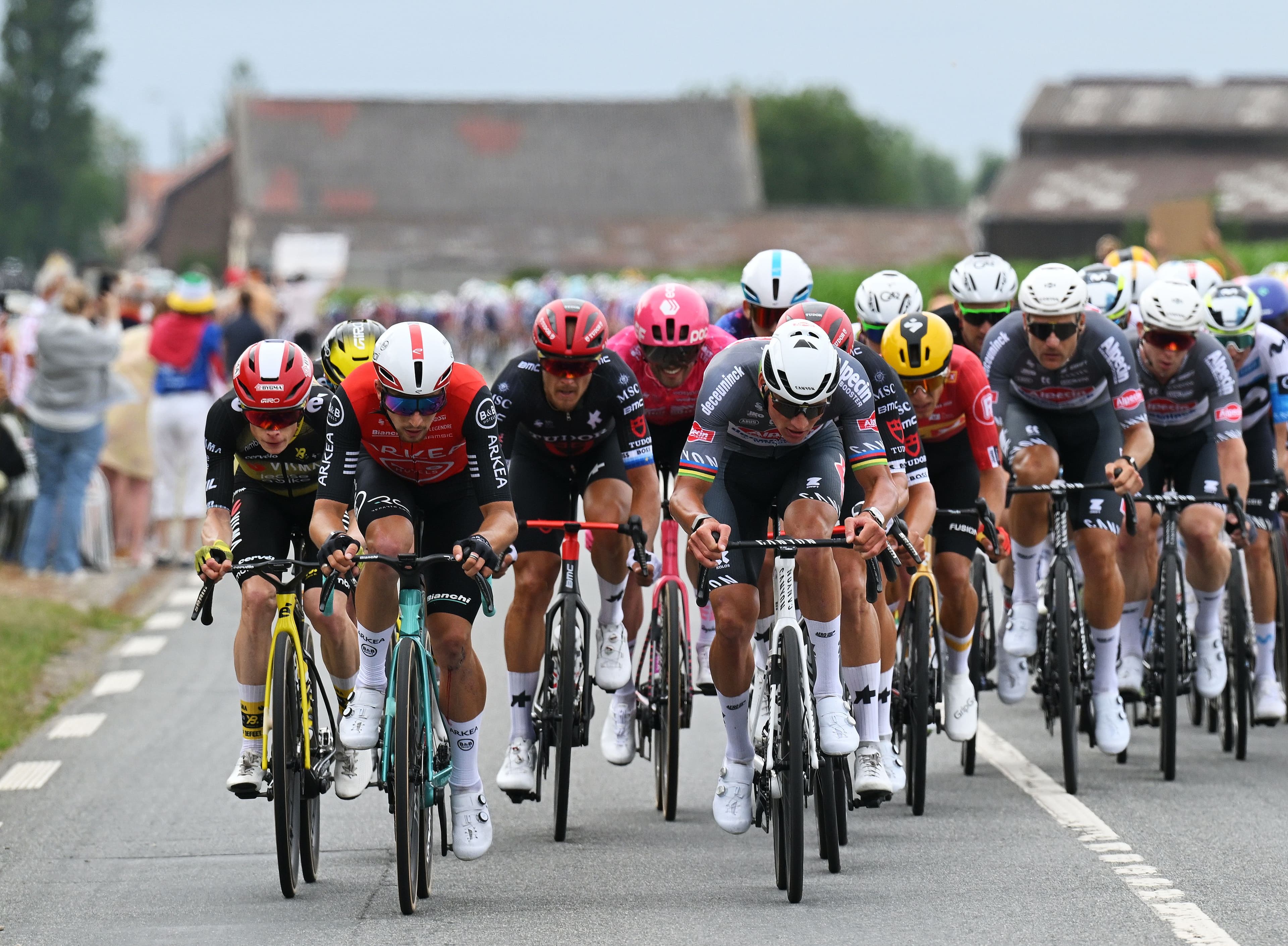 La première étape du Tour a été nerveuse, et balayée par le vent. Kévin Vauquelin accroche le groupe qui se joue la victoire dans le final suite à un coup de bordure.