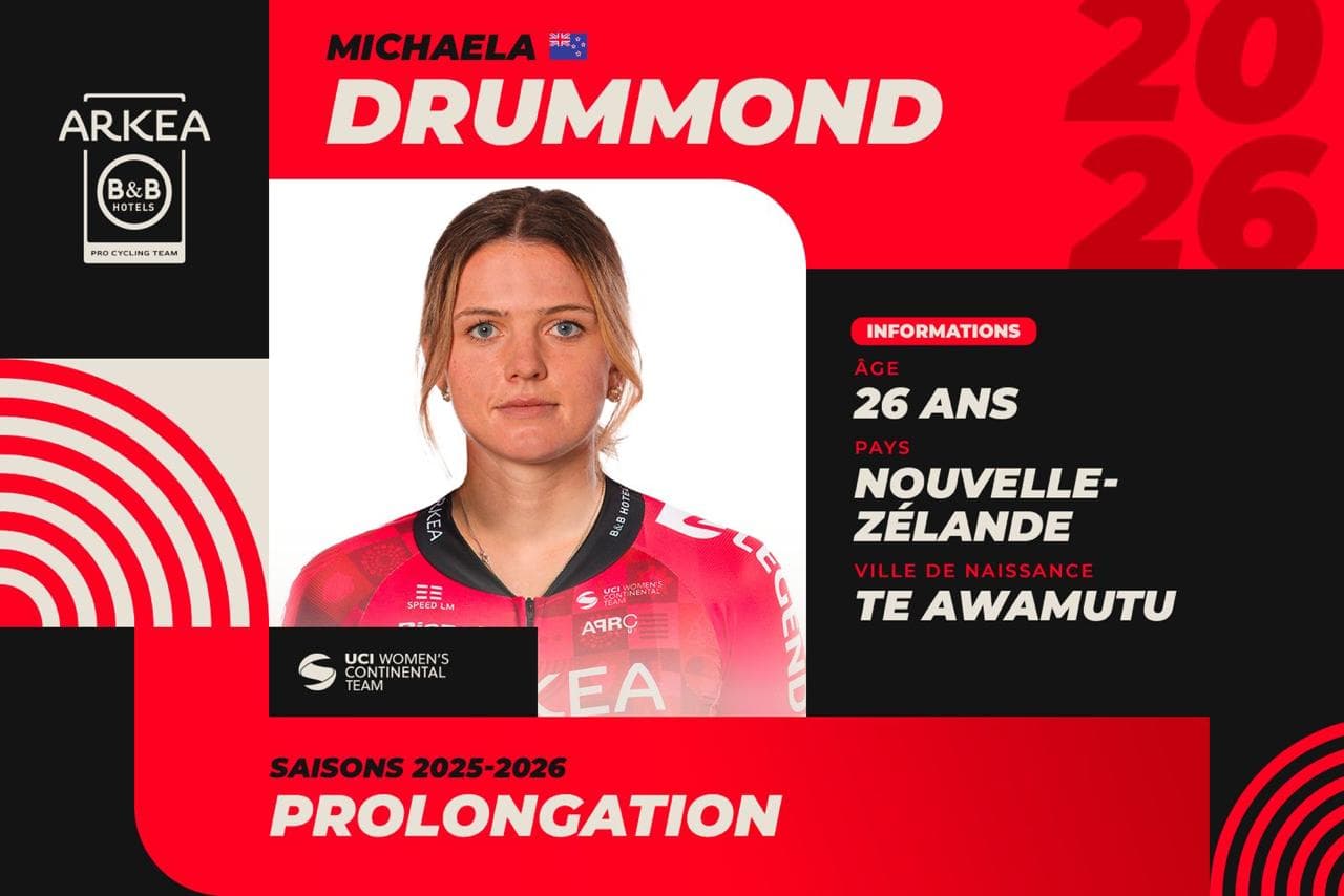 Lauréate d’étapes sur le Région Pays de la Loire Tour et sur le Tour du Portugal, Michaela Drummond a prolongé son contrat avec l’équipe ARKEA-B&B HOTELS jusqu’en 2026.